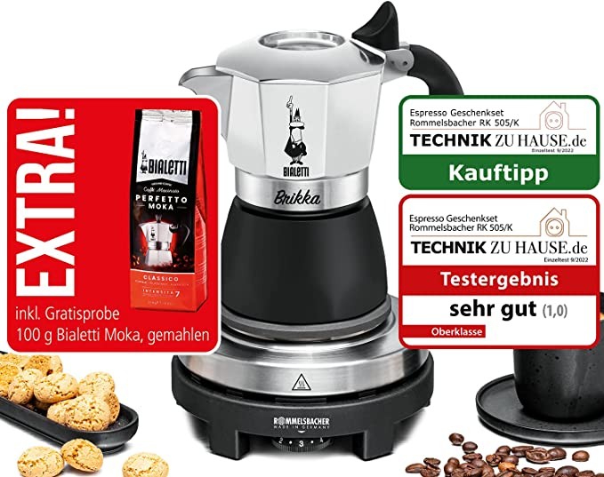 Rommelsbacher espresso gift set RK 505 / K-mini cooking plate, diameter 80 mm, infinitely adjustable, original Bialetti moka pot, 90 ml cream-forming brewing system, incl. 100 g mocha grind, black/sil