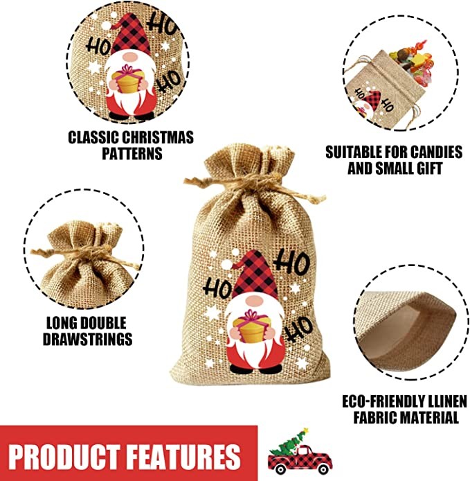 VEYLIN 12 pieces of Christmas jute gift bags in 12 designs. These lovely Xmas jute sacks features Santa Claus, snowman, car, bell, Christmas tree etc, the motifs are well printed and ideal for kids Christmas party gifts. Product description: Quantity: 12pcs