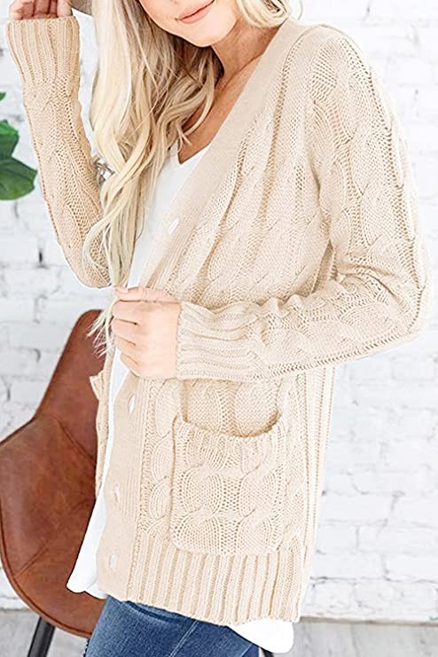 YACUN Women's Cable Knit Cardigan Long Sleeve Button Down Sweater with Pocket Knit, Beige, Small