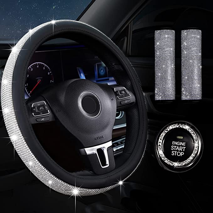 GEISTHOT 4-piece shiny car accessories, suitable for women and girls, car decoration package, rhinestone shiny steering wheel cover universal suitable for 15 inches, shiny car * with cover, shiny star