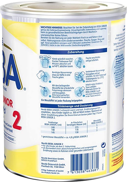 Nestlé BEBA JUNIOR 2 Toddler Milk Powder For Toddlers From 2 Years Old, 6 Cans (6 x 800g)