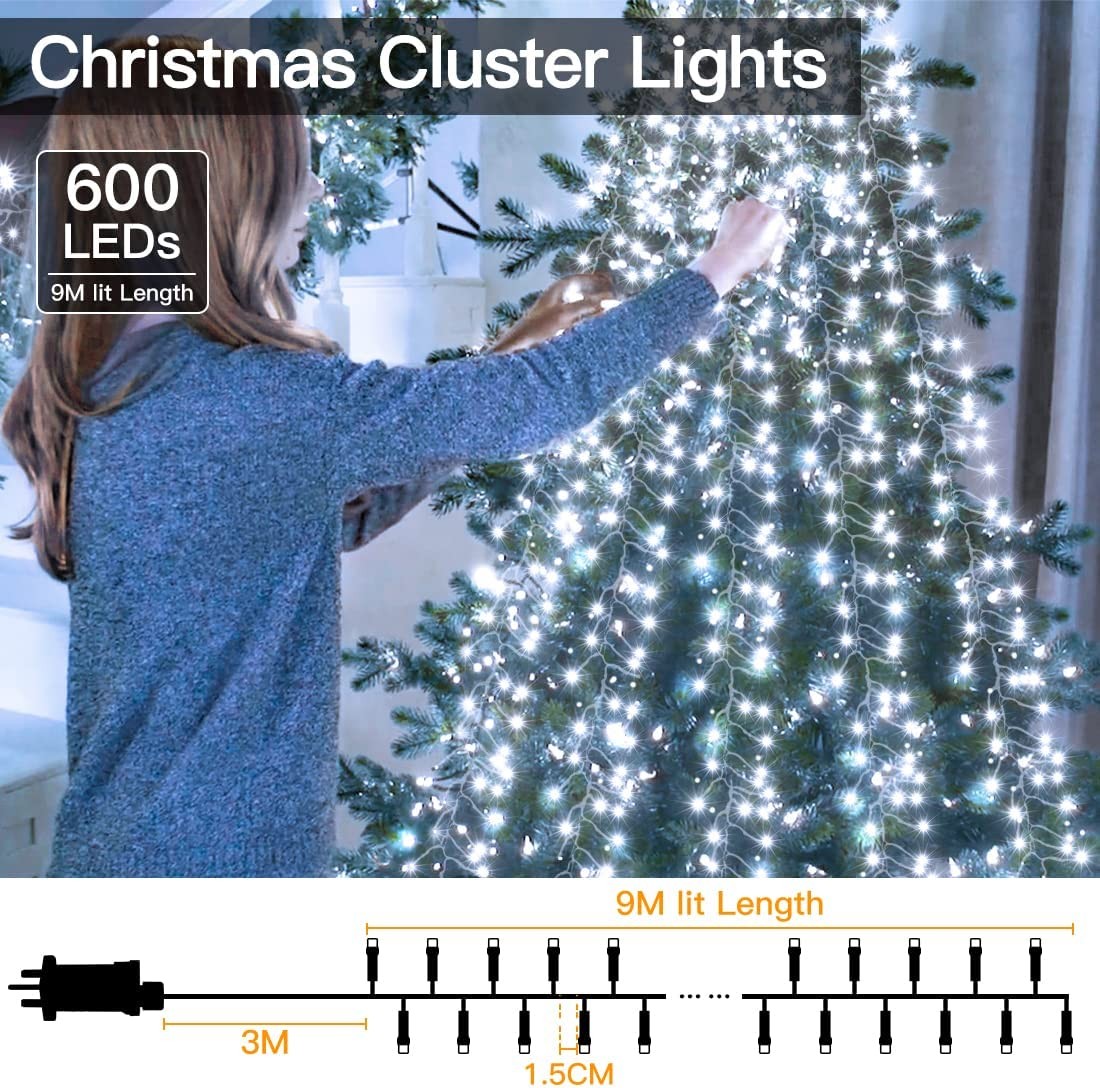 • 9M 600 LEDs Christmas Fairy Lights - Ollny outside cluster string light are constructed with copper wire material, has 600 LEDs, 9m long enough as Christmas decoration hanging all wreath, garland, windows, stairs or gazebos and decorating the Christmas tree, creating the ultimate Christmas wow-factor in your garden with this Onlly white cluster LED lights.