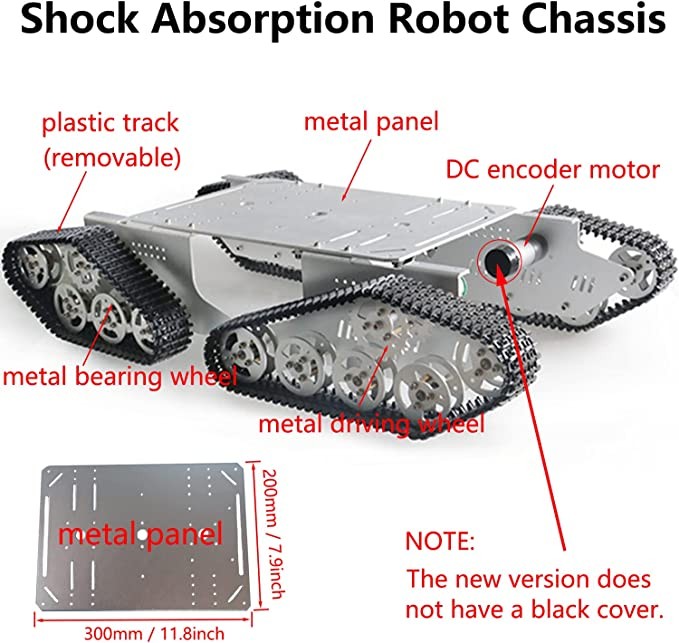 【WHAT YOU WILL RECEIVE】What you will get: 5 pieces of metal plates, 4 pieces of DC encoder motors with cable wires, 4 pieces of plastic rails/caterpillars, 20 pieces of metal load wheels with bearings, 4 pieces of drive wheels and other screws parts and tools. After receiving the product, please read the instruction manual first to assemble. It's not difficult, but requires very little patience.
