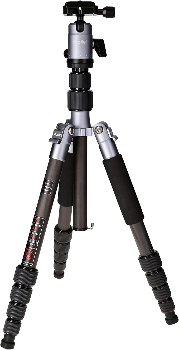 Rollei compact portable travel tripod, carbon fiber, titanium, with small package, ball head and tripod bag